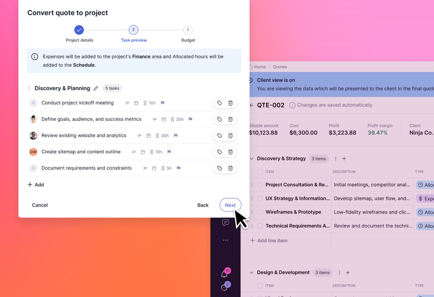 Convert your quote to a tentative or confirmed project for a efficient flow from proposed work to active delivery.