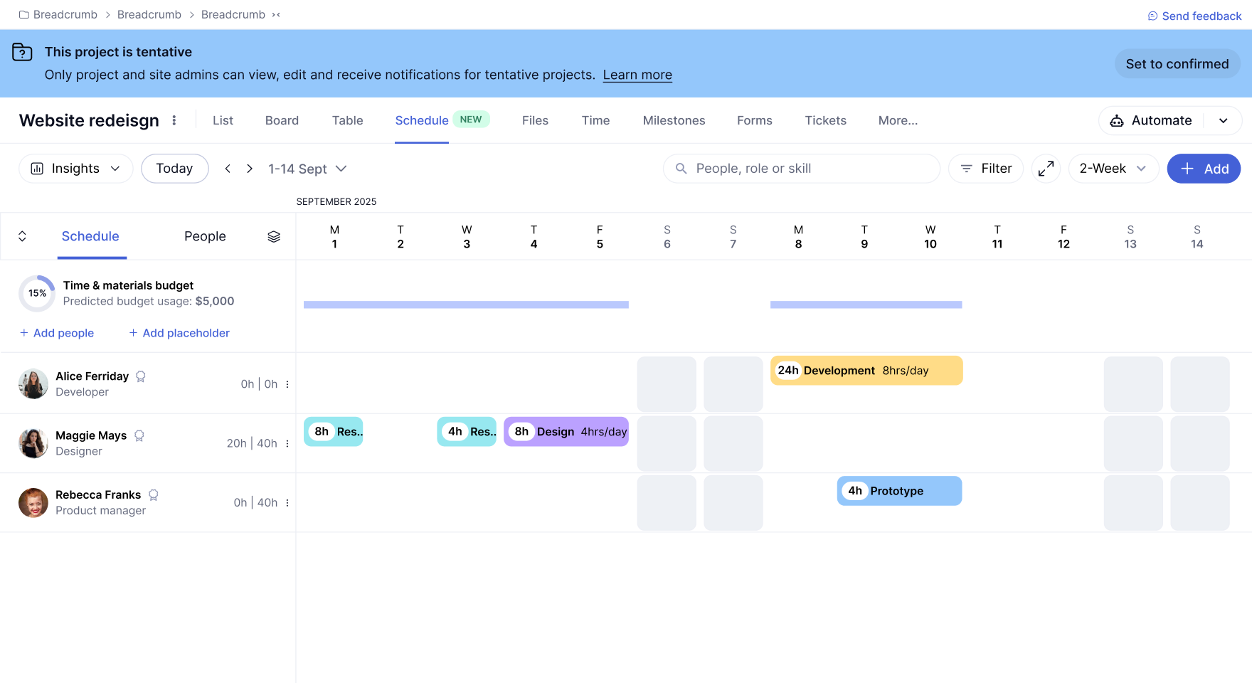 Your playground to reserve capacity, map resourcing, and forecast revenue. Set to "confirmed" when ready.